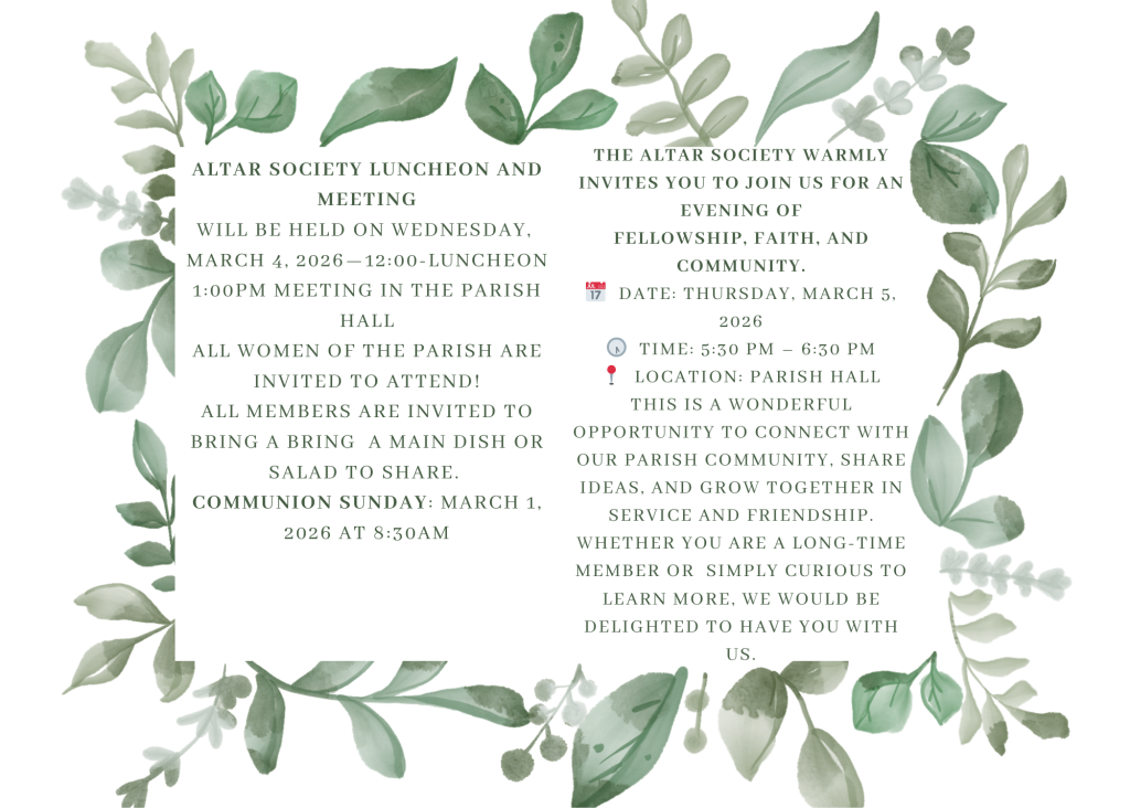 Answering the needs of Catholic men through prayer, formation and fraternity. Calling all men of the parish! The Knights of Columbus is forming a Men’s Prayer Group in our parish. Their next meeting will take place on February 23, 2026. For more information, contact Chris Wamsley at bubbawams@hotmail .com or contact the parish office.