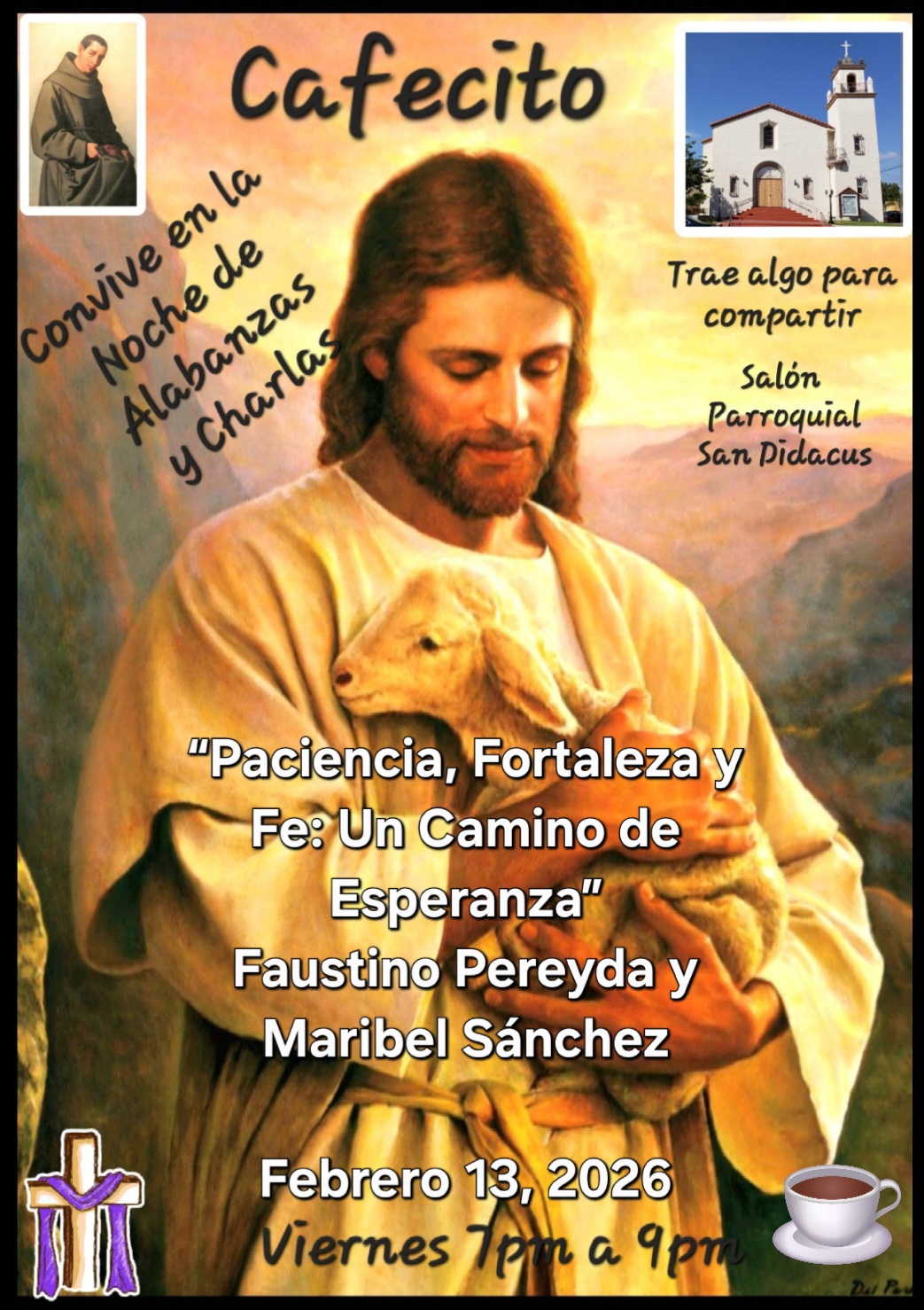 Cada segundo viernes de mes de 7pm a 9pm en el salón parroquial. Todos son bienvenidos a acompañamos con Alabanzas, Charlas, Convivencias, Reflexión Espiritual y Comunitaria. Por favor, traiga comida para compartir. ¡Acompañamos!